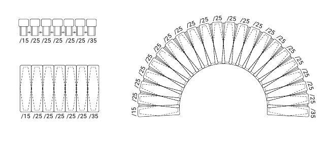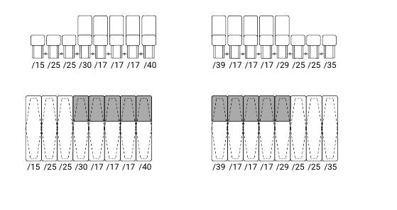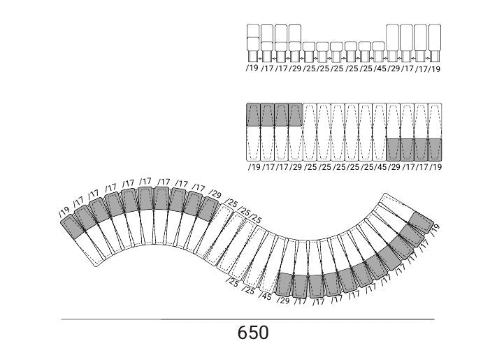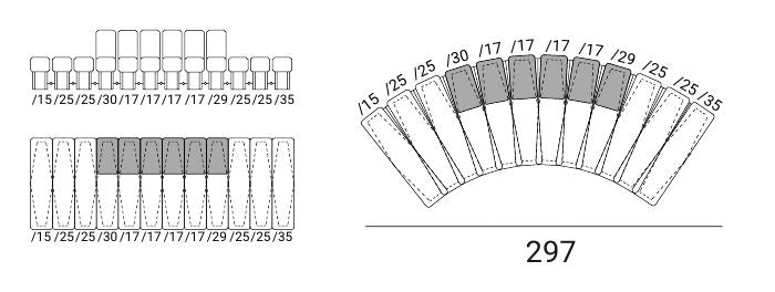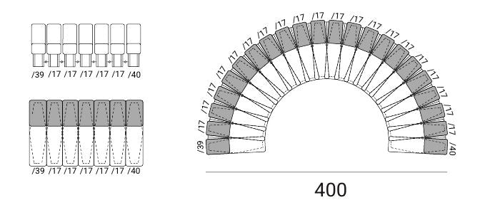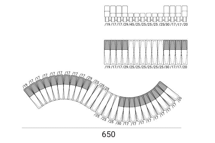 /19: 팔걸이 있는 좌측 끝 요소, /39: 팔걸이 없는 좌측 끝 요소, /17: 등받이가 있는 중간 시트, /20: 팔걸이 있는 우측 끝 요소, /40: 팔걸이 없는 우측 끝 요소, /35: 우측 스툴 끝 요소, /29: 우측 스툰로 전환 요소, /30: 좌측 스툴로 전환 요소, /15: 좌측 스툴 끝 요소, /25: 중간 스툴 요소, /45: 방향 전환 특수 요소, /55: 방향 전환 스툴(/25, /30용), /05: 독립형 스툴