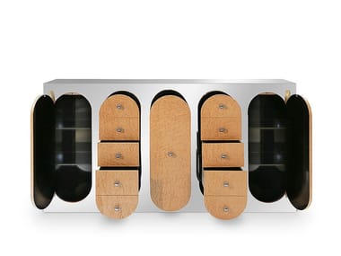 Mid-century meets transitional style in this simple and clean console. Claire is produced in polished stainless steel and its square body contrasts with the rounded set of drawers and doors. These are finished in birdseye maple leaf to accent its presence. Altogether with the little doorknobs make this a unique piece of mid-century furniture.