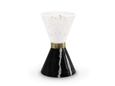 Vinicius is an hourglass shaped side table finely produced in nero marquina marble and polished estremoz marble. Together, they are the perfect example of duality and contrast. Vinicius is accentuated by a gold plated brass center piece and its sleek curves add a refined statement to any interior decor.