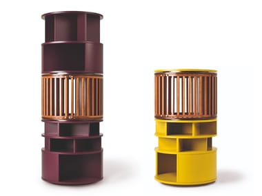 Babel is a multi-functional and cylindrical cabinet, made of overlapping volumes, full and empty parts, which rotate around a central pivot and change face according to how they are oriented.