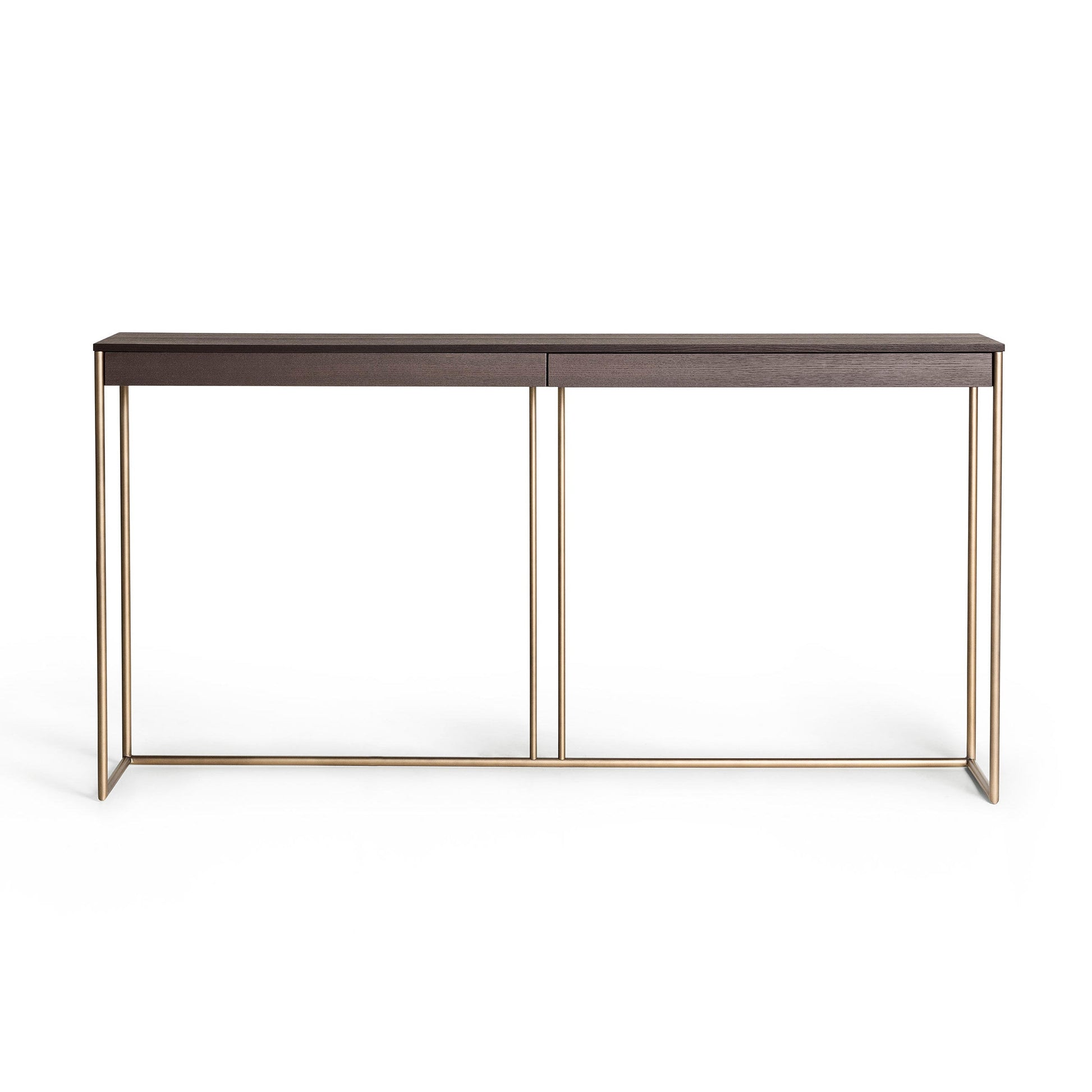 The Ella console table is a fusion of different materials, styles and volumes, reflecting David Lopez Quincoces’ ability to combine different influences and his clean design style, which ensures function remains the central focus of any project. With character provided by the materials used and sheer attention to detail involved, this traditional piece takes on a contemporary spirit thanks to the contrast between the sleek structure in bronze-coated metal, which seems almost to hover in mid-air, and the solid table top with drawer in heat-treated oak. A versatile console table that can be used on its own or in combination with other pieces, Ella brings bold sophisticated to any room or project.