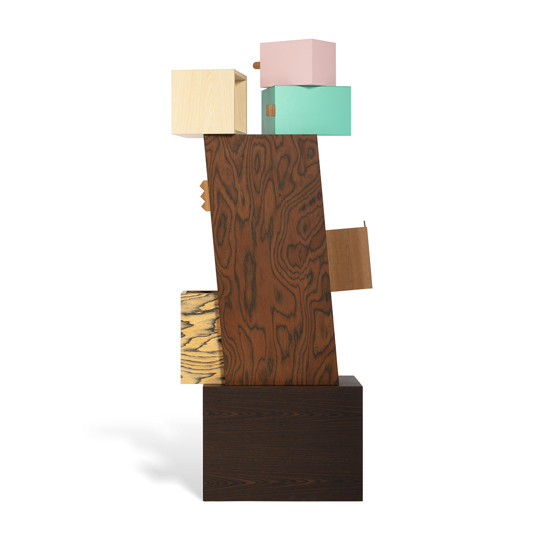 A seemingly unstable combination of vertically stacked geometric forms, accentuated by the juxtaposition of different textures. Amazon by Marco Zanini is a storage cabinet which takes its name from the famous river in South America, whose bends are suggested by the zig-zag form of the central volume and the arrangement of the “drawers”.Cabinet covered with wood veneer, lacquered elements.