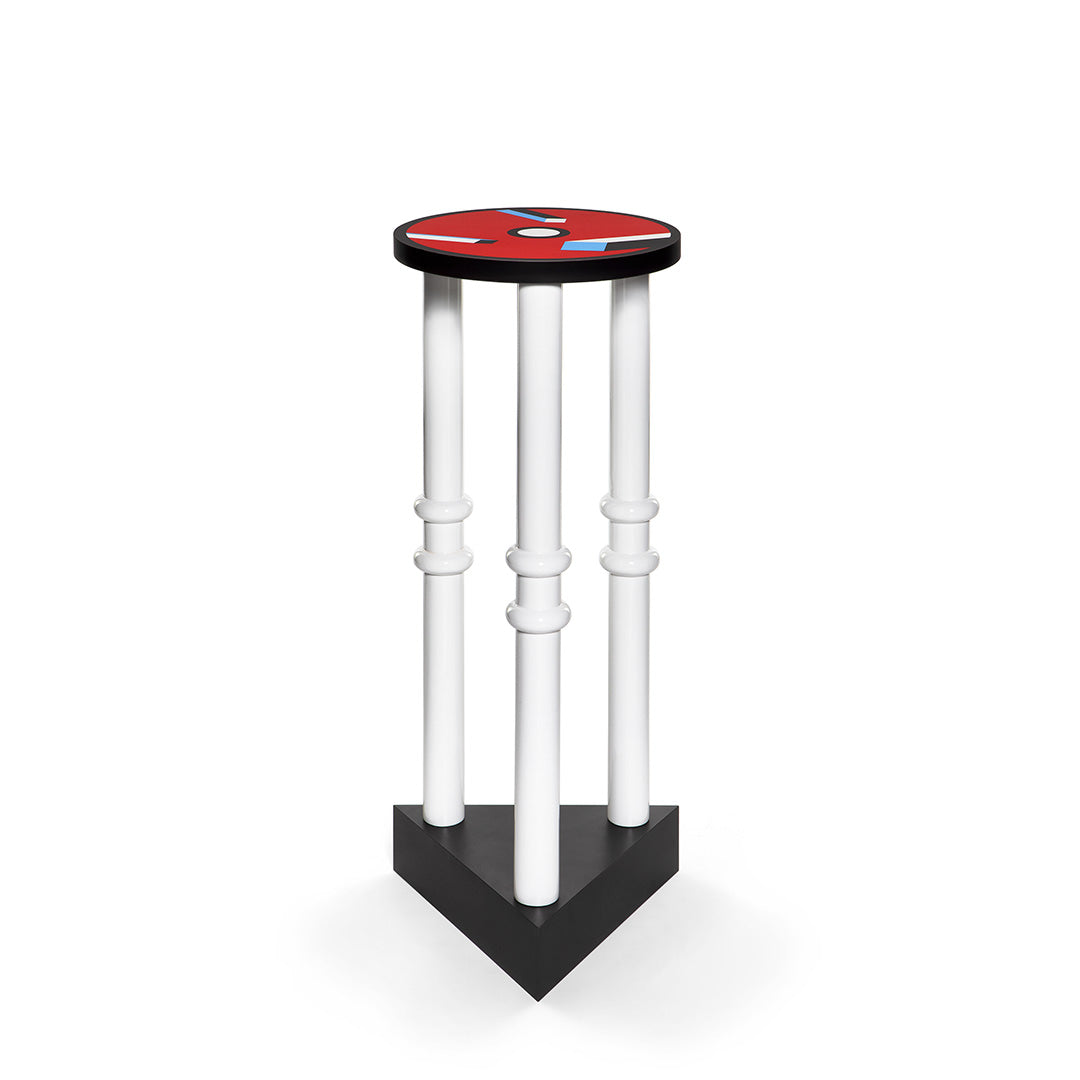 Ironically skeptical about the form and idea of a table, the eclectic concept of Bombay by Nathalie Du Pasquier makes it a veritable anti-modern icon. Bombay is a reminder of India, visited in youth, suggested here by the rounded rings resembling the pillars of temples. As Du Pasquier says: "everything I see inspires my art".Tall side table with lacquered wood legs and top covered in decorative laminate.