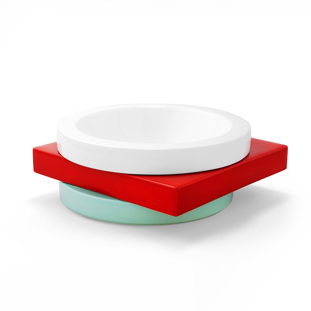 Broccoli is a fruit stand – named not for fruit but for a vegetable – designed by Marco Zanini in ceramic material painted by hand. The unusual form of the object is based on the staggered overlay of three geometric parts: the red square placed on the blue circular base supports the white bowl.Hand-painted ceramic fruit bowl.
