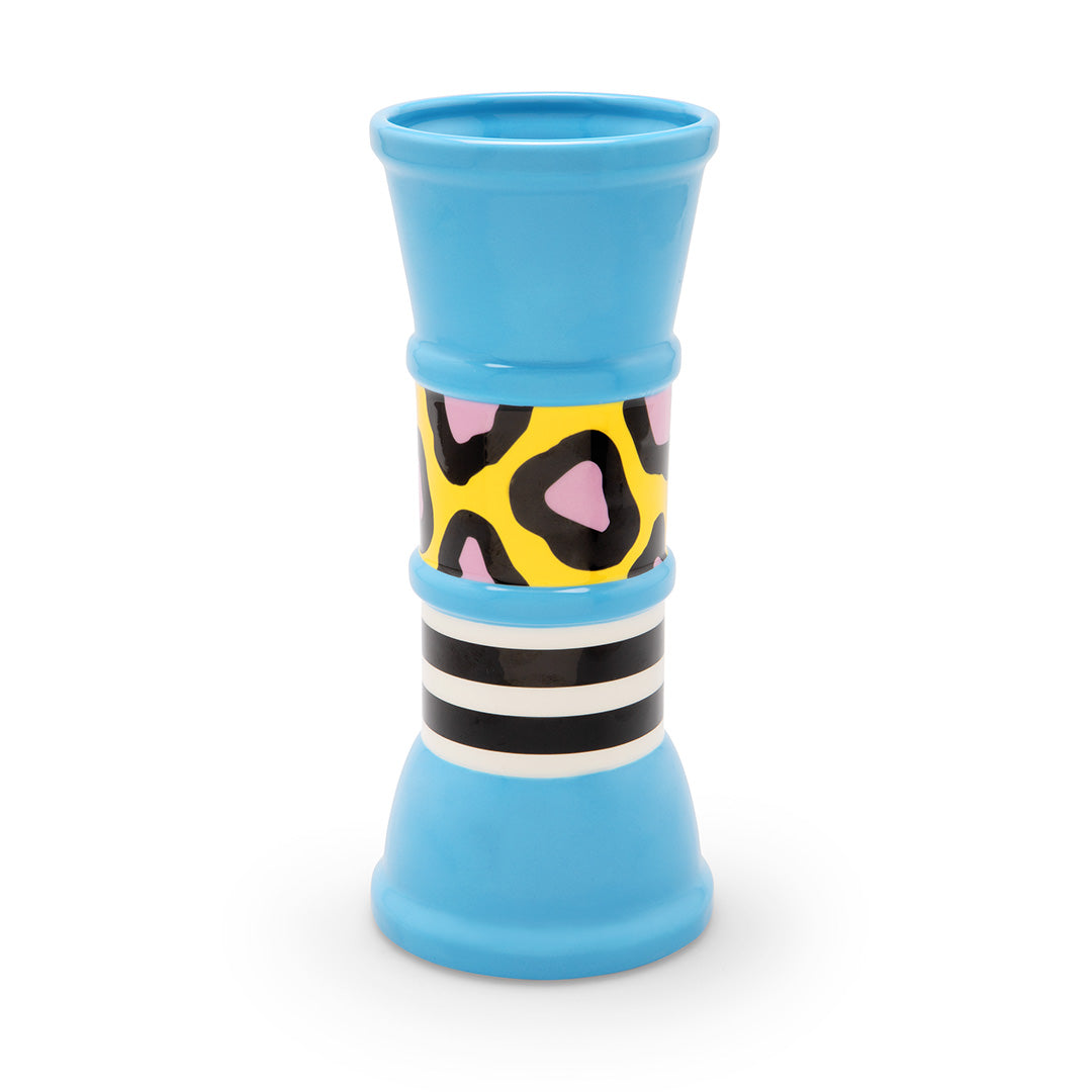 Nathalie Du Pasquier focuses on contrasting colors for Carrot, a cylindrical handpainted blue ceramic vase with two bands relying on decorative decals, sublimated in the kiln.Hand painted ceramic vase with kiln-sublimated decorative decals.
