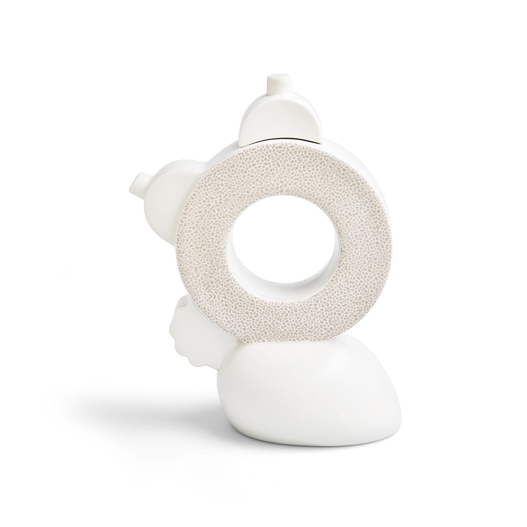 Matteo Thun wagers on white for a series of objects in porcelain created for Memphis, turned and shaped by hand. The attention of the observer is caught not by the color but by the unusual form of the objects, suggesting active participation in the experience. The Chad teapot (1981) disrupts the habitual characteristics of the object, thanks to a circular form with a hole in the middle.Hand turned and shaped white porcelain teapot with kiln-sublimated decorative decals.