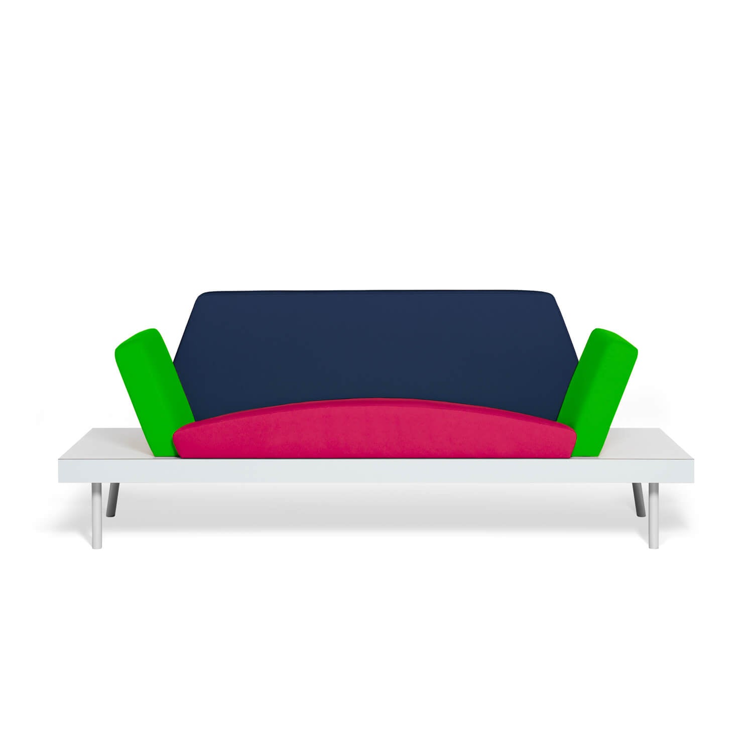 Futuristic design and lively colors are the characteristics of Dublin, the sofa created by Marco Zanini for Memphis in 1981.Since the early 1980s, Dublin is also offered in a combination of colors, juxtaposing green armrests and a pink seat with the blue of the back: this version of the elegant sofa by Marco Zanini was created for the legendary apartment of Karl Lagerfeld in Monaco, completely furnished with the finest creations of Memphis.Wooden sofa covered with decorative laminate, painted metal legs, fabric upholstery. Limited edition of 10 pieces.