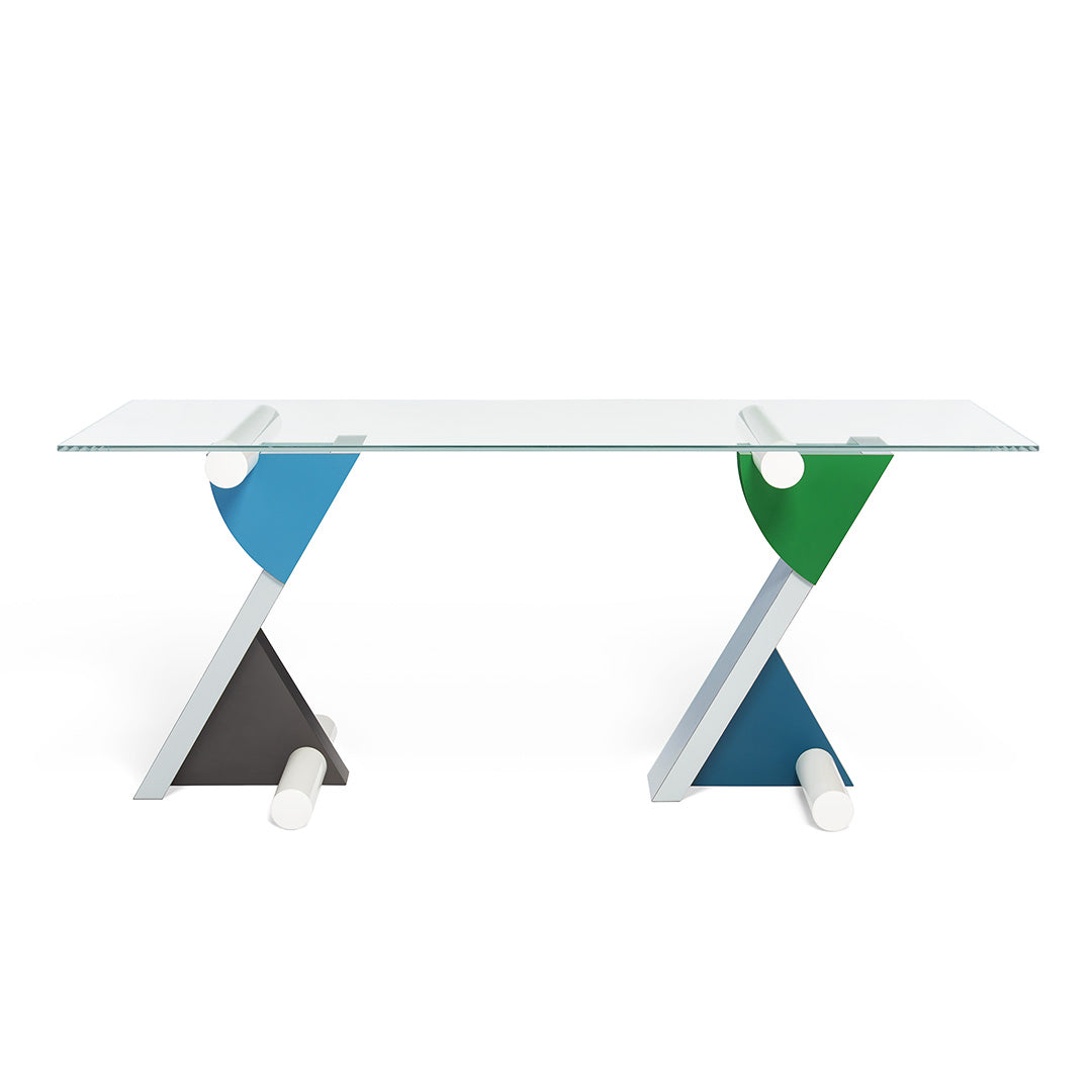 Architectural design, basic forms and unexpected lines that offer a glimpse of a disruptive force pushing on the glass. These are the ingredients that make Fortune by Michele De Lucchi an iconic Memphis masterpiece. The striking feature of Fortune are the “legs” in tones of green and blue: the top of the table, namely its most “functional” part, seems to vanish due to the transparency of the glass.Table with tempered glass top, wooden legs covered with decorative laminate, lacquered elements.