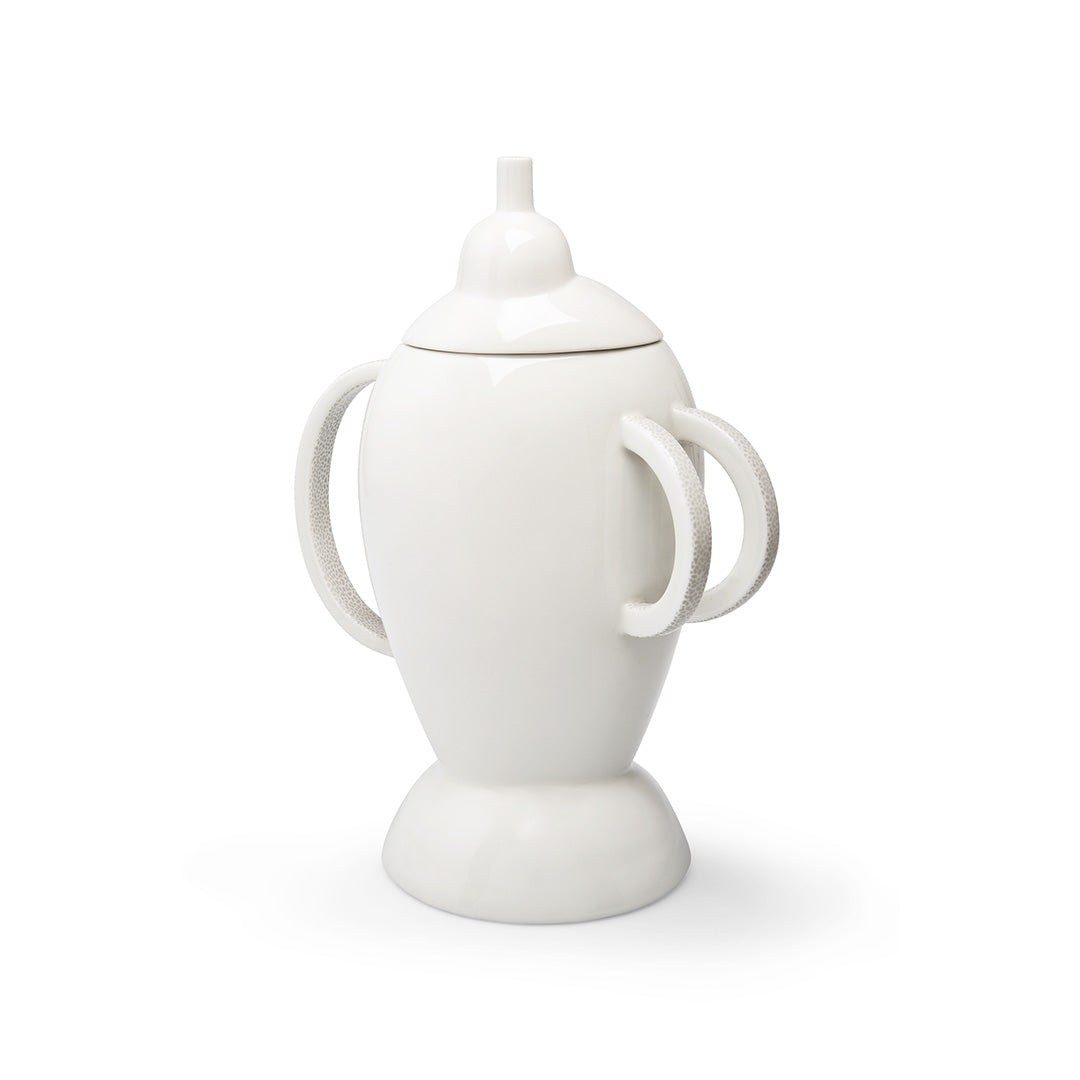 Matteo Thun wagers on white for a series of objects in porcelain created for Memphis, turned and shaped by hand. The attention of the observer is caught not by the color but by the unusual form of the objects, suggesting active participation in the experience. Garda is a porcelain amphora with handles that wittily evoke the classical tradition.Hand turned and hand shaped white porcelain amphora with kiln-sublimated decals.
