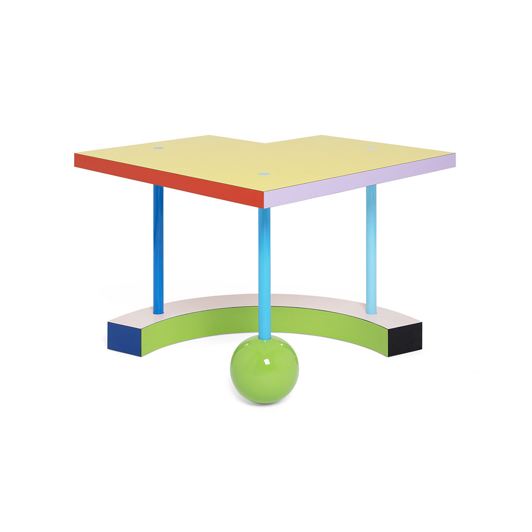 Hollywood by Peter Shire is like the concrete result of what might happen when we toss geometric solids into the air, allowing them to magically come together in an unusual, unexpected object. Every form, every color has been painstakingly studied. The three legs in different hues seem to pierce the top, while the borders in vivid tones, and the spherical lacquered “leg” punctuate the design with further explosions of color.Side table in wood covered with decorative laminate, painted metal elements.