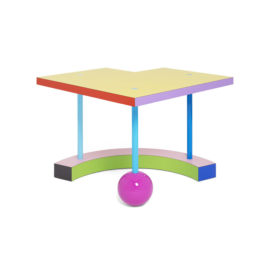 Hollywood by Peter Shire is like the concrete result of what might happen when we toss geometric solids into the air, allowing them to magically come together in an unusual, unexpected object. The three legs in different hues seem to pierce the top, while the borders in vivid tones, and the spherical lacquered “leg” punctuate the design with further explosions of color.Side table in wood covered with decorative laminate, painted metal elements. Limited edition of 7 pieces.