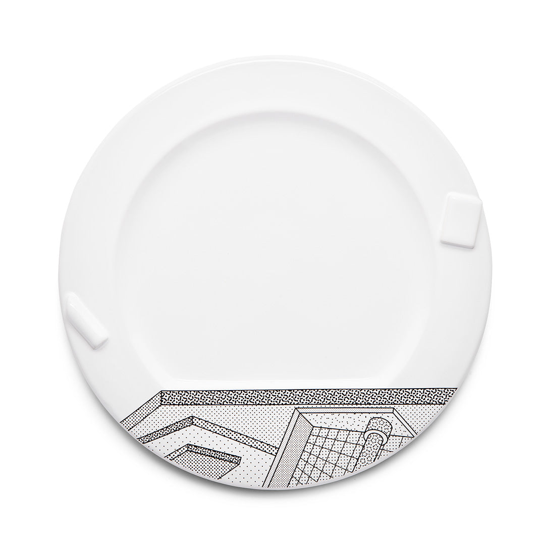 The series of plates Indivia, Lettuce and Rucola designed by Ettore Sottsass in 1985 – all white with black graphic decorations representing portions of architectural drawings, for the first two, or small spots for Rucola – play in a surreal way with the names of vegetables that do not seem to correspond to the designs in terms or color or figuration. Is the reference to what will be eaten from the dish?Serving plate in white ceramic with kiln-sublimated decorative decals.