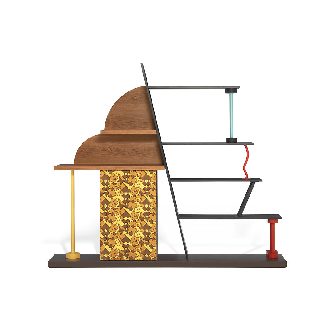Malabar by Ettore Sottsass smashes the established, solid and reassuring image of functionalist furniture, producing a sensation of surprise and food for thought. It combines contrasting forms and colors, seeming to confront us with two different worlds. The exotic forms and the name evoke India, which become stronger presence in Sottsass’ work starting in the 1970s.Cabinet in wood covered with decorative laminate and wood veneer, lacquered elements.