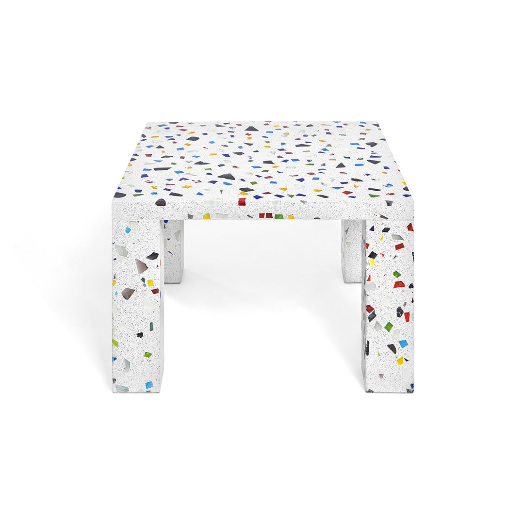 The serving table Nara by Shiro Kuramata perfectly combines the Japanese aesthetic tradition with the principles of western design. There is no separation between construction, form, inner essence and materials. The simplicity of the structure is ironically contrasted by the texture of colored patches typical of terrazzo.Hand casted terrazzo coffee table, traditional concrete base and coloured glass elements.