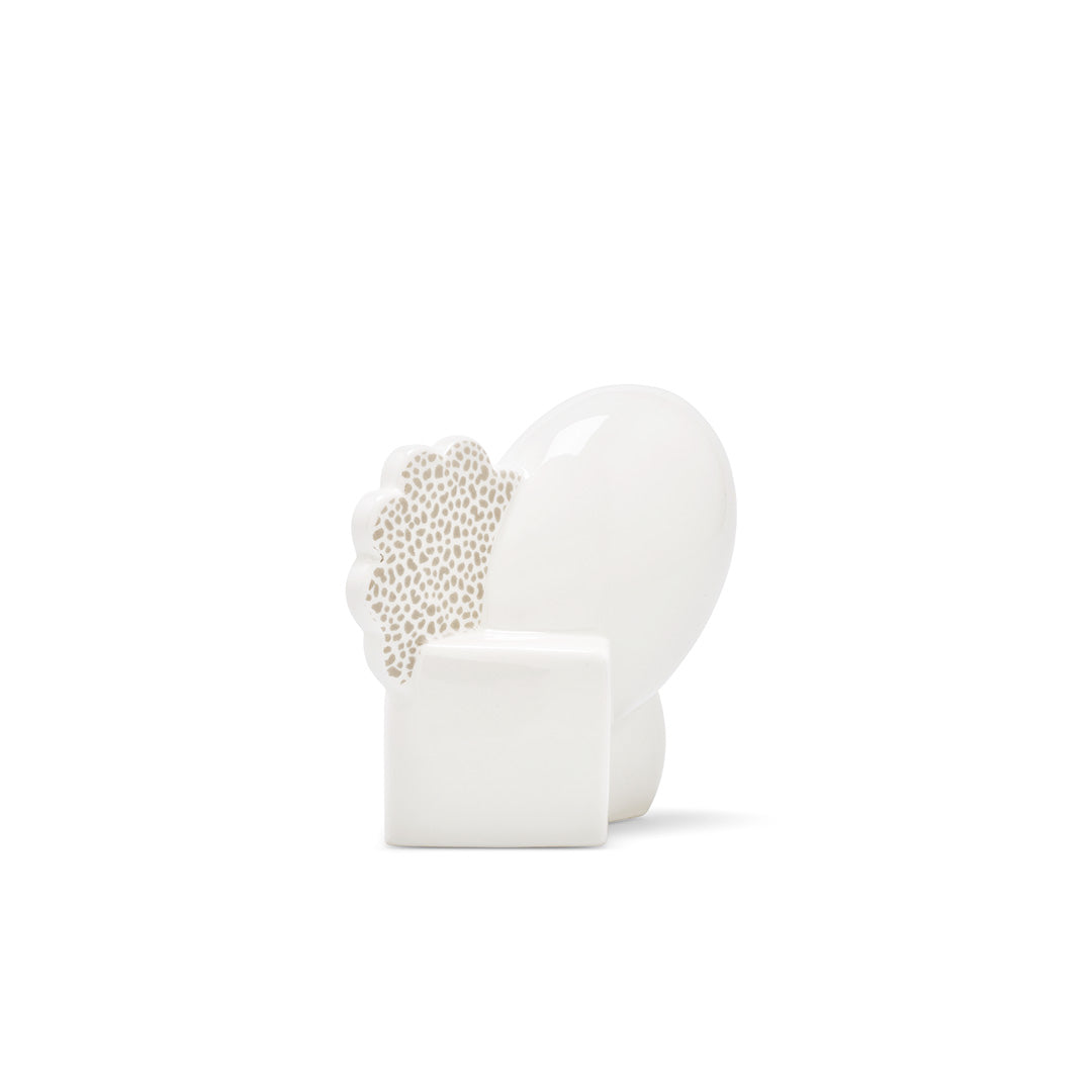 The Ontario pepper grinder, designed by Matteo Thun, can accompany the Manitoba tray. This series of porcelains "demonstrates the typically witty anti-functionalism of Memphis and epitomizes what Barbara Radice called emotional objects", write Fay Blanchard, Alice Riddy and Eva Haghighi.Hand-turned and hand-shaped white porcelain pepper holder with kiln-sublimated decorative decals.