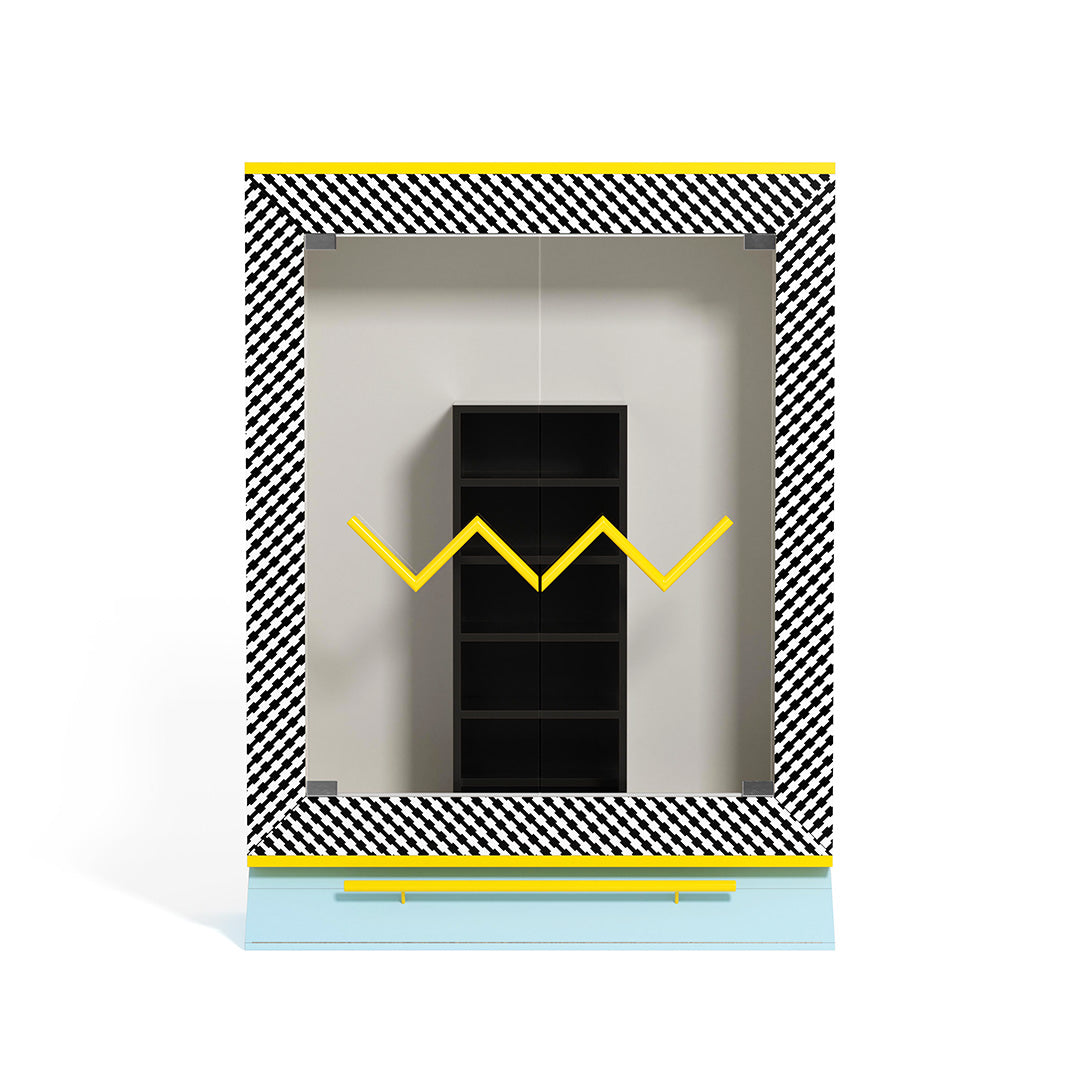 Pacific by Michele de Lucchi is an enigmatic piece: a storage cabinet, or a work of architecture? Perhaps it is both. With the anarchic and irreverent character typical of Memphis, De Lucchi simultaneously asserts and denies the true function of Pacific, as if to leave the final verdict up to the observer.Wooden wardrobe covered with decorative laminate, tempered glass doors, metal elements.