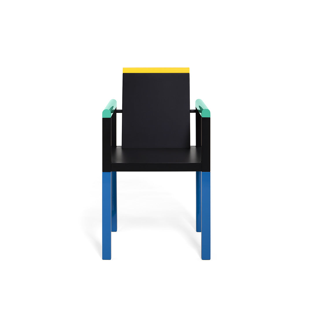 The solemn, essential presence of Palace by George J. Sowden makes this chair a true icon of the quiet transformation of Memphis. Palace reinterprets the rationalist forms of design, referencing the clean lines of Bauhaus while highlighting the structural members with color.Chair in lacquered wood.