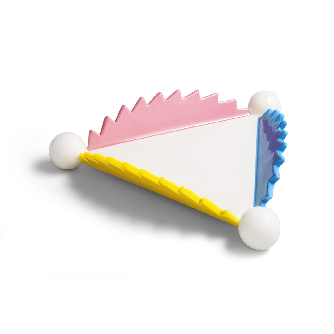 Masanori Umeda plays with forms in Orinoco, a bizarre ceramic vase with a white stem and blue spheres at the base. Spheres also connect the borders of Parana, the ceramic fruit holder shaped and painted by hand. The Japanese designer chose the names of two of the biggest rivers in Latin America for this ironic experimentation on the combination of shapes, including the creative linkage of the vertices of a triangle.Shaped and hand painted ceramic fruit holder.