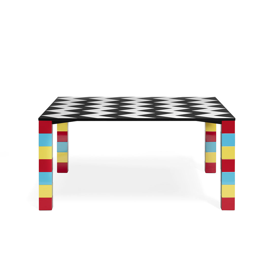 Designed by George Sowden in 1981, Pierre is a table of great impact in lacquered wood, covered with decorative laminate on a metal frame. The structure is composed of four wooden legs with a square section, lacquered with red, yellow and blue stripes. The wooden top has a zigzag motif in black and white.Looking at the remarkable body of original work created by George J. Sowden in 1981, we also discover a version of Pierre with the blocks decorating the legs in black and white rather than in colors, triggering an evocative motif of elegance and refinement. From the outset, the designer saw into the future, imagining Pierre in these two very different but also harmonious versions.Table made of lacquered wood elements, covered with decorative laminate, mounted on a metal frame.
