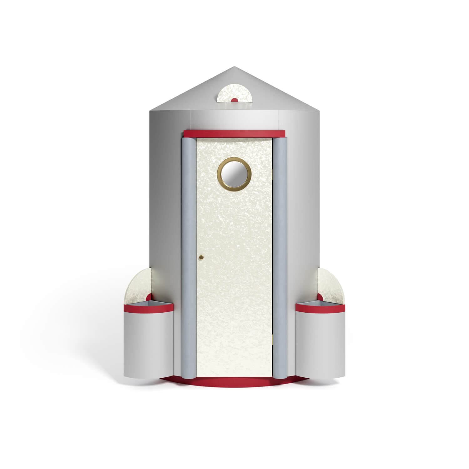 Who knows why Matteo Thun chose the name Sacher, like the famous Viennese chocolate cake, for a corner cabinet whose curious form and colors remind us of a rocket on its way into space?Sacher is a metaphysical cabin reaching upward, composed of three containers of different sizes: at the center, the larger panel opens like a door topped by a tympanum, through which to peer into the inner chamber through a porthole. Irony, spatial metaphor, Sacher never ceases to amaze with its mysterious form and a few touches of red.Hallway cabinet in wood covered with decorative laminate. Limited edition of 10 pieces.Mobile da ingresso rivestito in laminato decorativo. Edizione limitata di 10 pezzi.
