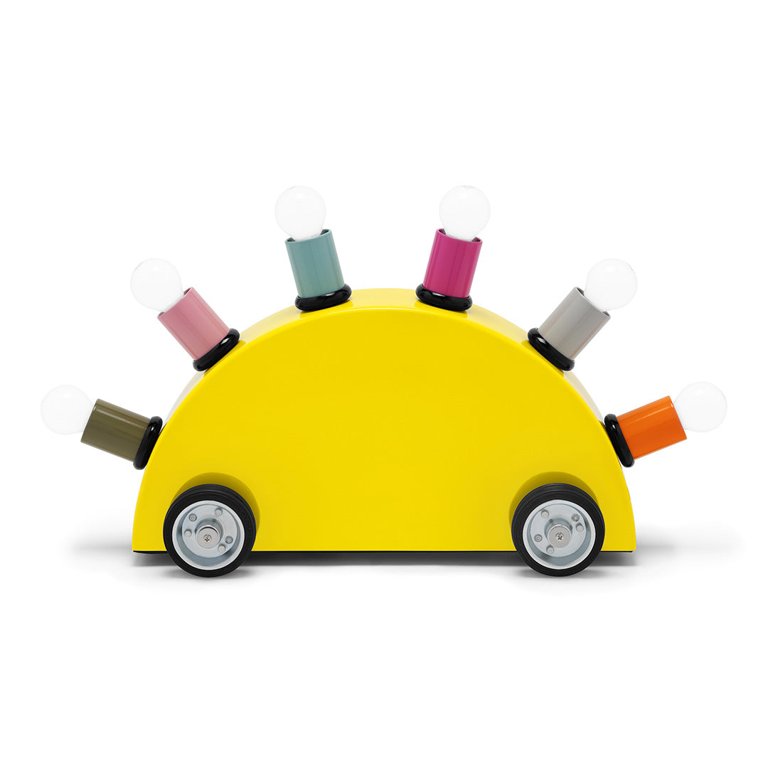 The Super lamp by the designer Martine Bedin can be dragged along like a dog on a leash (with an arched back resembling a stegosaurus), embodying the playful spirit of Memphis. It is made with a semicircle in lacquered fiberglass resting on four rubber wheels. Six colored cylinders contain the sockets for the bulbs. The light bulbs themselves are part of the image of the lamp.Floor or table lamp in structural polyurethane and metal.Power MAX 30WVoltage EU: 230VTemperature 3000KLight source 6x LED E14 5W (EU incl.)