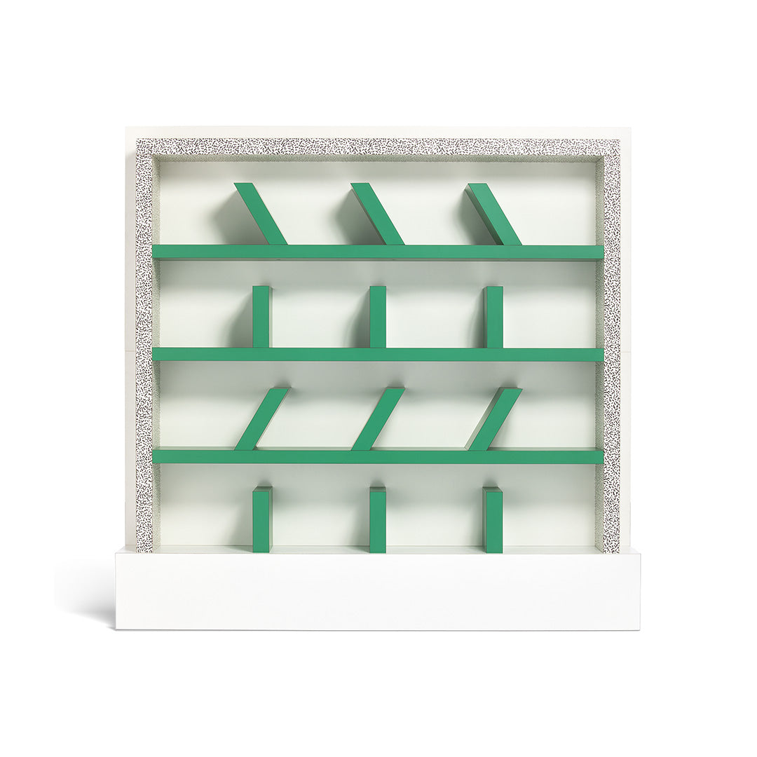 A bookcase in wood covered in decorative laminate, designed by Ettore Sottsass in 1981, Suvretta has unconventional shelves, because the angles of all the rows are different.“Suvretta” is a word in Romansh meaning: “above the forest.” Like stacked rows of trees, the books placed on the green shelves of Suvretta take on a vertical and diagonal rhythm. The three divider elements of the vibrant green shelves of Suvretta alternate sloping and vertical postures, generating a simple, dynamic composition emphasized by the “Bacterio” texture (also designed by Sottsass).Bookcase in wood covered in decorative laminate.