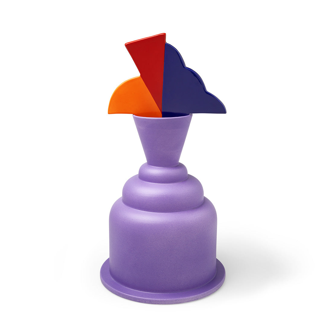 This vase in multicolored ceramic bear the names of the large African lake. Designed by Marco Zanini, it rests on substantial circular bases that rise upward, supporting a sort of fantasy flower composed of a futuristic corolla emphasized by live colors and interlocking geometric shapes.Turned, shaped and hand painted ceramic vase.