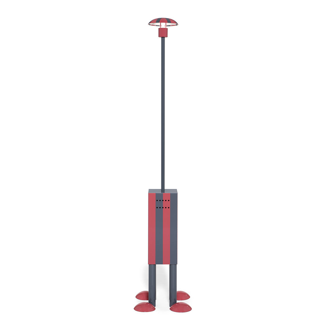Terminus is an enigmatic anthropomorphic presence: still, immobile, it stares at us and questions us. But dialogue is impossible. The tall steel tube terminating in a semi-spherical shade rests on a base of coated steel. The latter seems to suggest the body of a fantasy creature, composed of four tubes similar to legs, resting on four red cups resembling feet or paws.Painted metal floor lamp.Power MAX 5WVoltage EU: 230V US: 110VTemperature 4000KLight source 1x LED G9 5W (EU – US incl.)