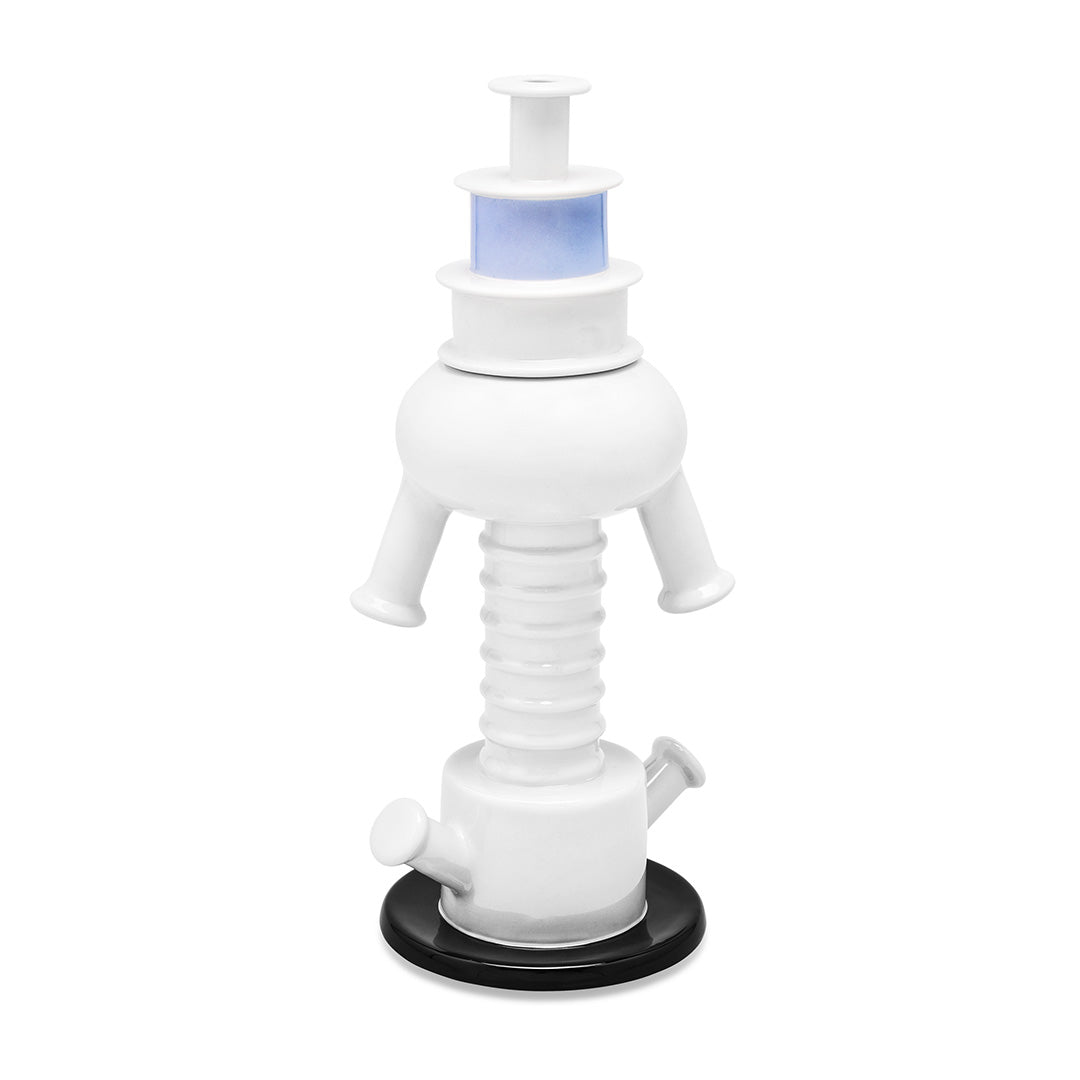 In 1983 Ettore Sottsass made a series of vases named for rivers – a clear reference to water – vertically stacking bizarre forms shaped in white porcelain, with a single touch of color. The form of the traditional ceramic vase is broken down and reassembled with interlocking parts, in an unstable balance. The effect is paradoxical and dynamic.Turned, shaped and hand-painted white porcelain vase.