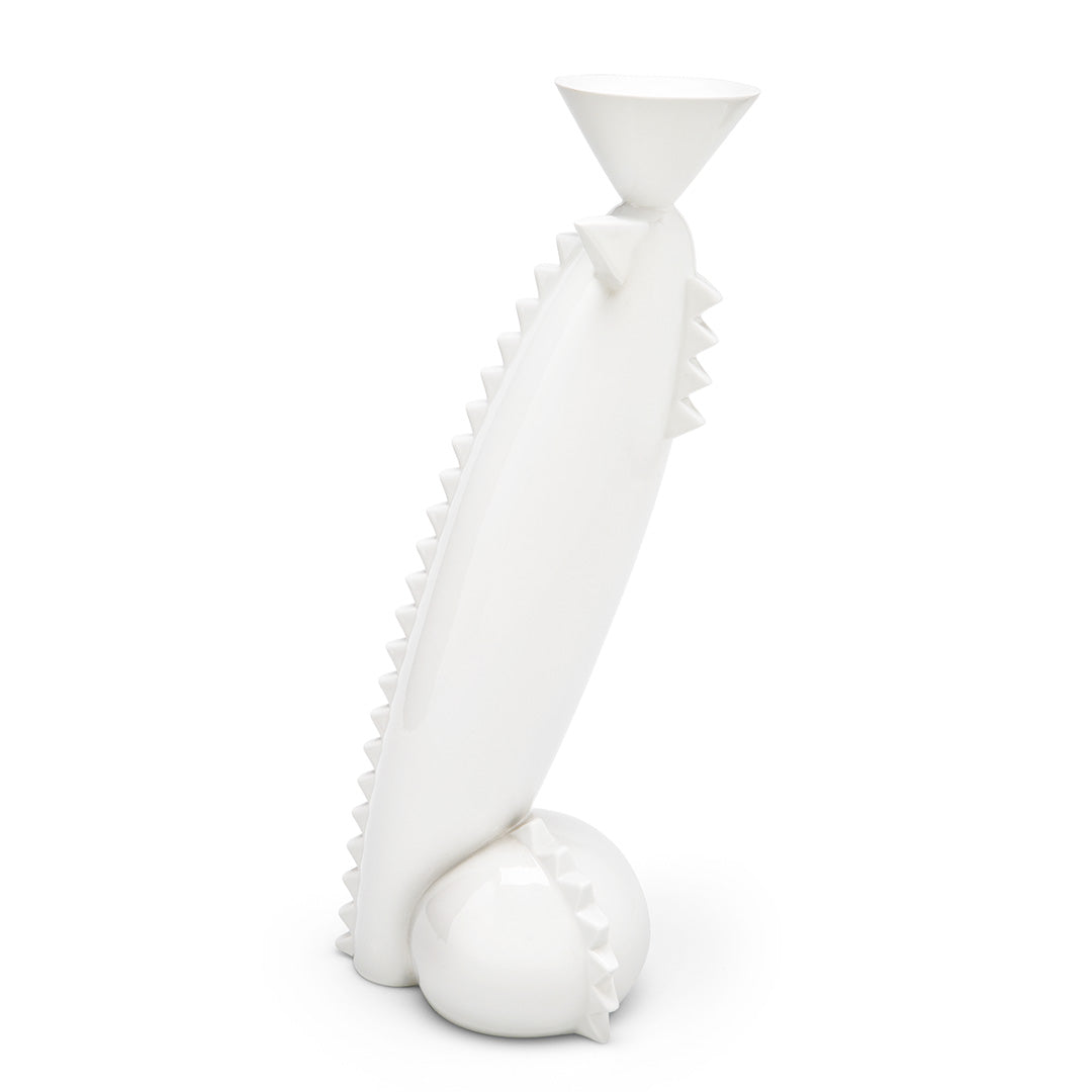 The series of objects in white porcelain created by Matteo Thun for Memphis enters the designer’s family tradition of pottery craftsmanship, while at the same time updating that tradition with a sort of “humorous anti-functionalism.” Volga (1983) plays with a diagonal slope that generates an apparently precarious balance, compensated by the triangular upper part.Hand turned and hand shaped white porcelain vase with kiln-sublimated decorative decals.