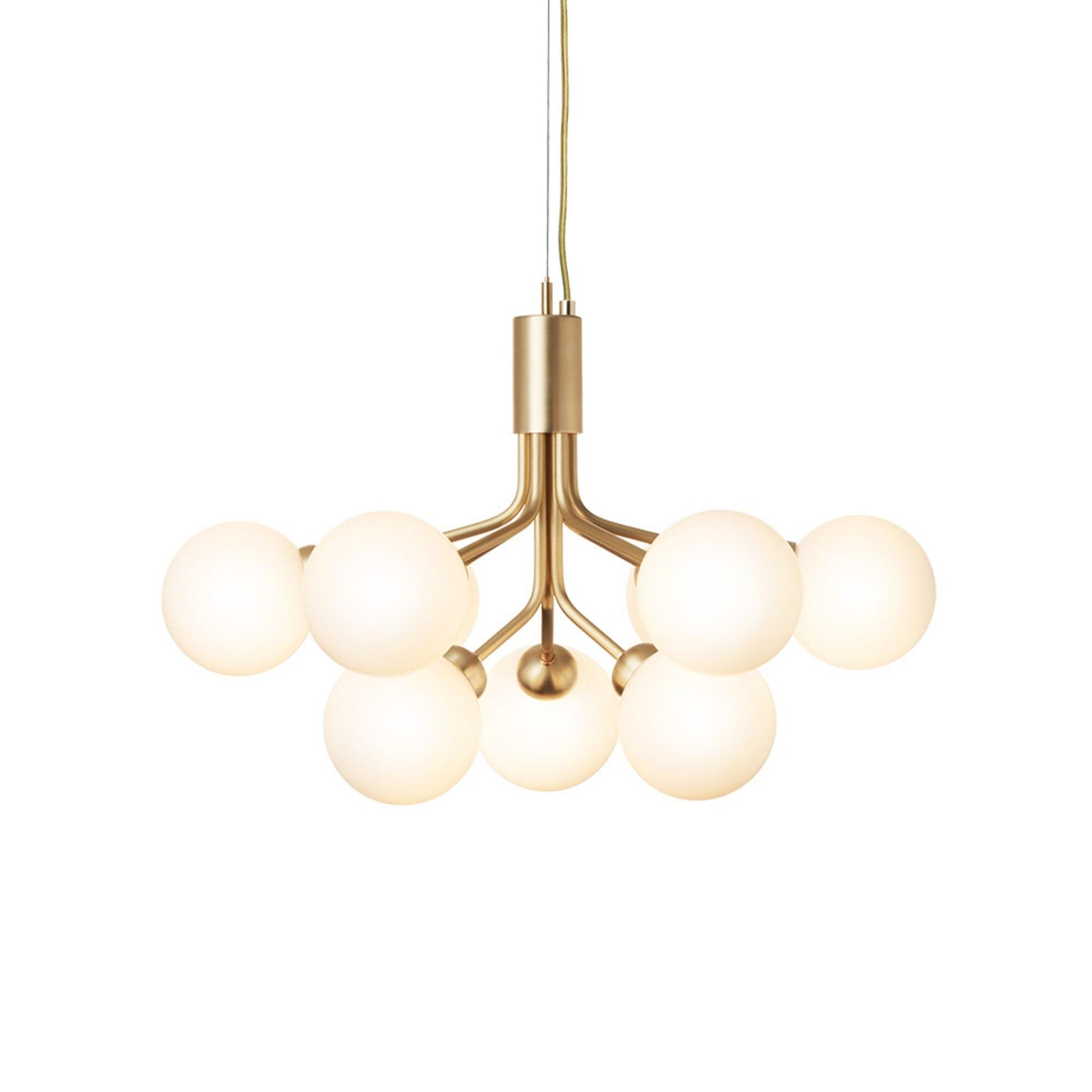 Concept: The Apiales from Nuura is a fantastic chandelier. The Nuura Apiales is a lamp that will catch anyone's attention upon entering the room. Finding its inspiration in flowers, the lamp has a soft and organic shape created by nine opal glass spheres in the Apiales 9 chandelier, respectively 18 opal glass spheres om the Apiales 18 chandelier. The lamp is perfect above the dinner table or in a corridor as the chandelier provides a fantastic light and a lovely warmth to the room. The Nuura Apiales pendant is of good craftmanship and the materials are of high quality. The chandelier has a calm and elegant expression. The Apiales is available in two sizes with nine, respectively 18 opal glass spheres, and in two colours; brushed brass and soft satin black.