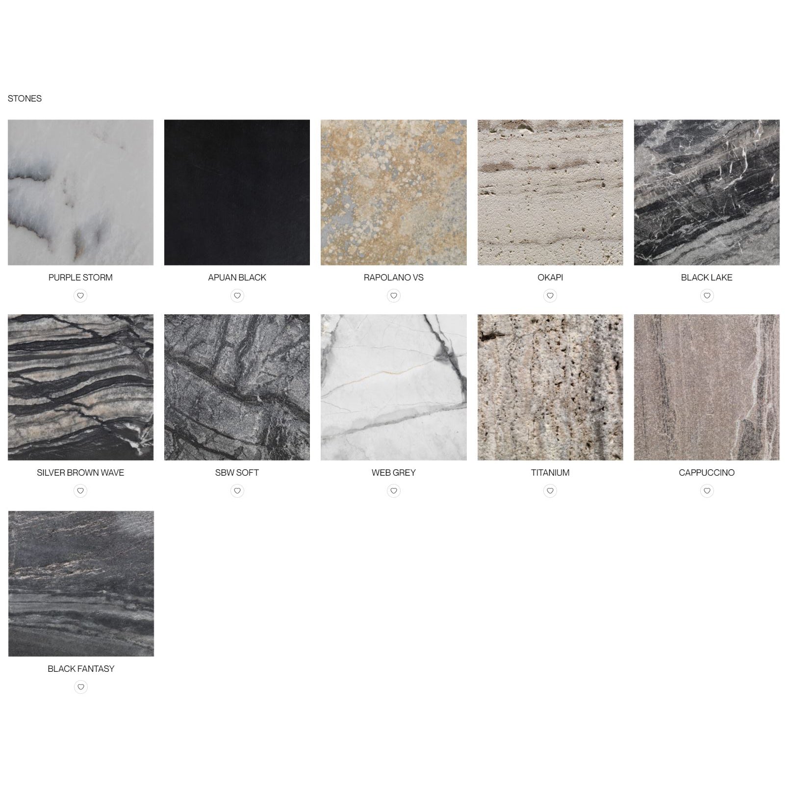 Top finishes, thickness 2 cm:Forest fusion or forest fusion black, Titanium foam, stones as per our samples.